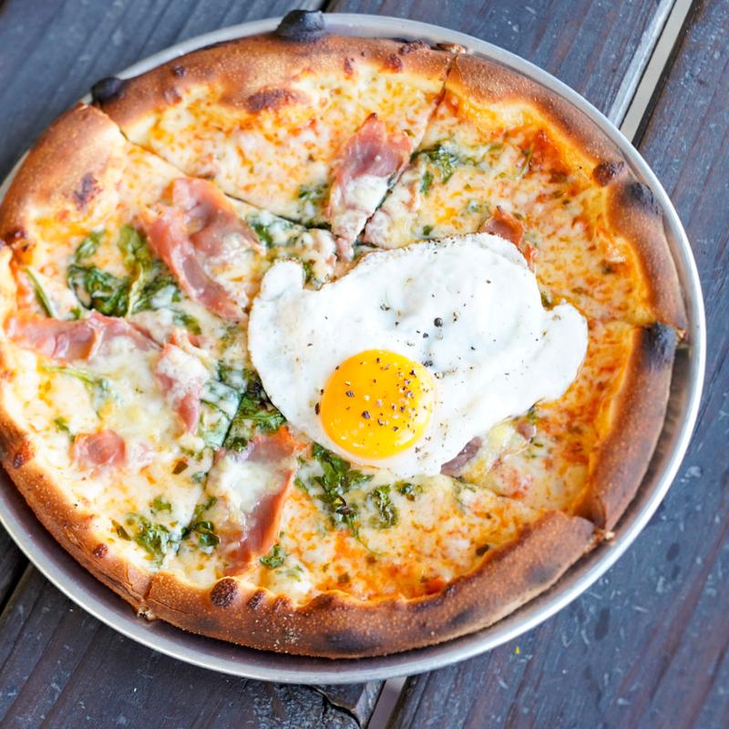 tomato fresca, mozzarella, fontina, prosciutto, baby kale, truffle oil & farm egg